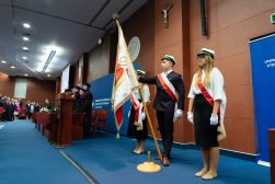 Absolwenci złożyli lekarskie przyrzeczenie zawodowe, na ręce opiekuna roku dr n. med. i n. o zdr. Beaty Chełstowskiej, a w imieniu rocznika przemówiła lek. Martyna Iwanowska, dziękując kadrze za sześć lat wspólnej pracy.